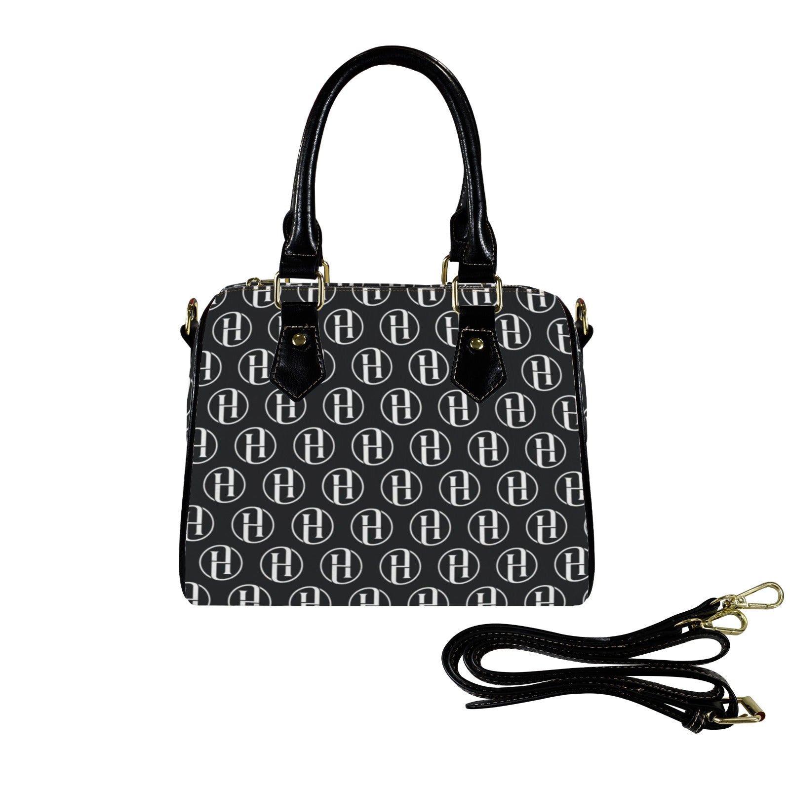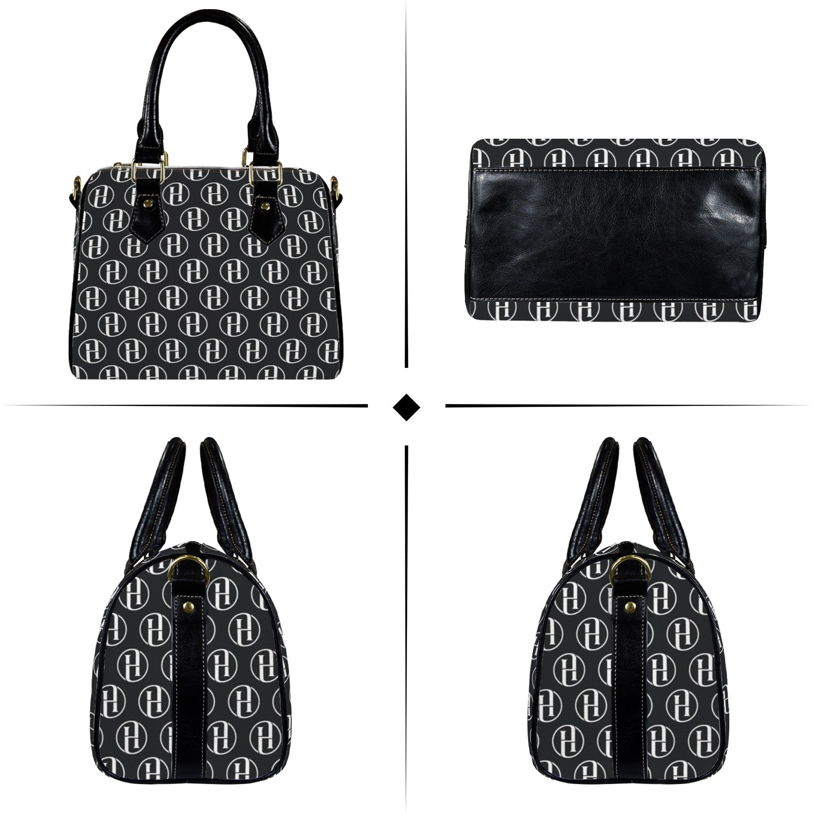 HILORA Designer-Handtasche – PU-Leder – Schwarz – Vollflächiger HILORA-Print (Modell 1746)